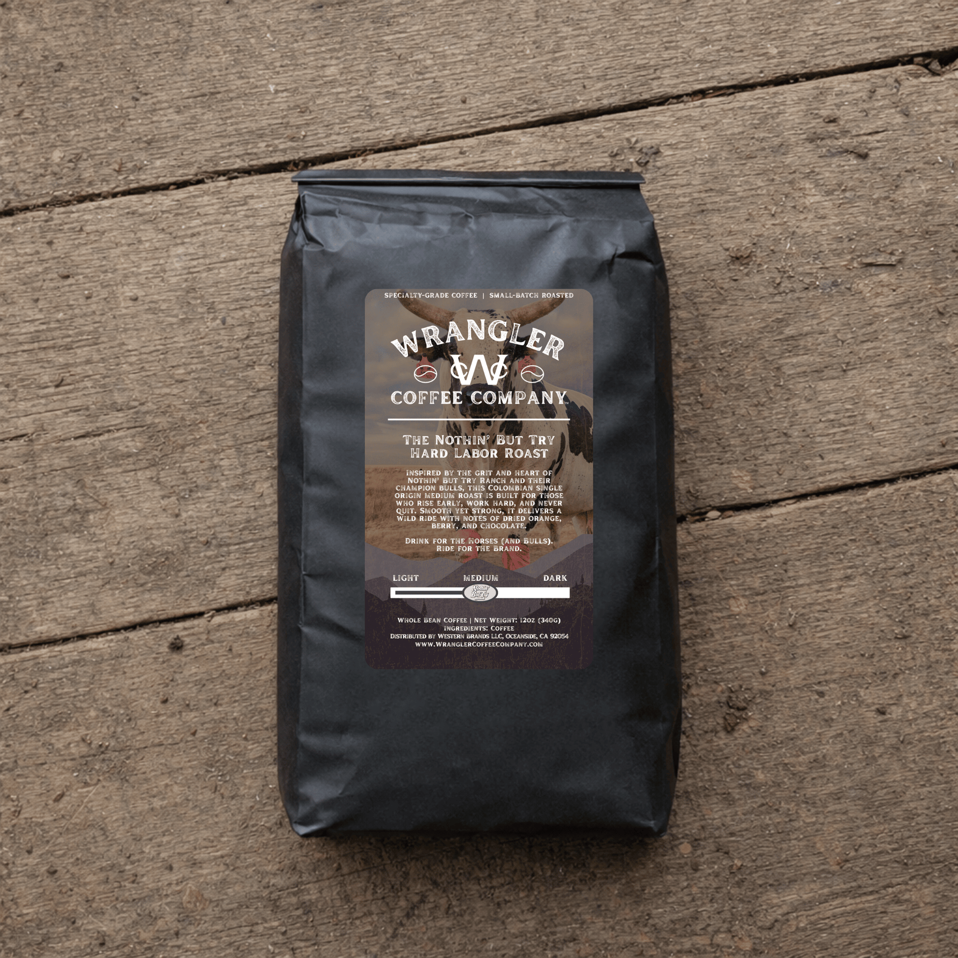 Inspired by the grit and heart of Nothin’ But Try Ranch and their champion bulls, this Colombian single origin medium roast is built for those who rise early, work hard, and never quit. Smooth yet strong, it delivers a wild ride with notes of dried orange, berry, and chocolate.